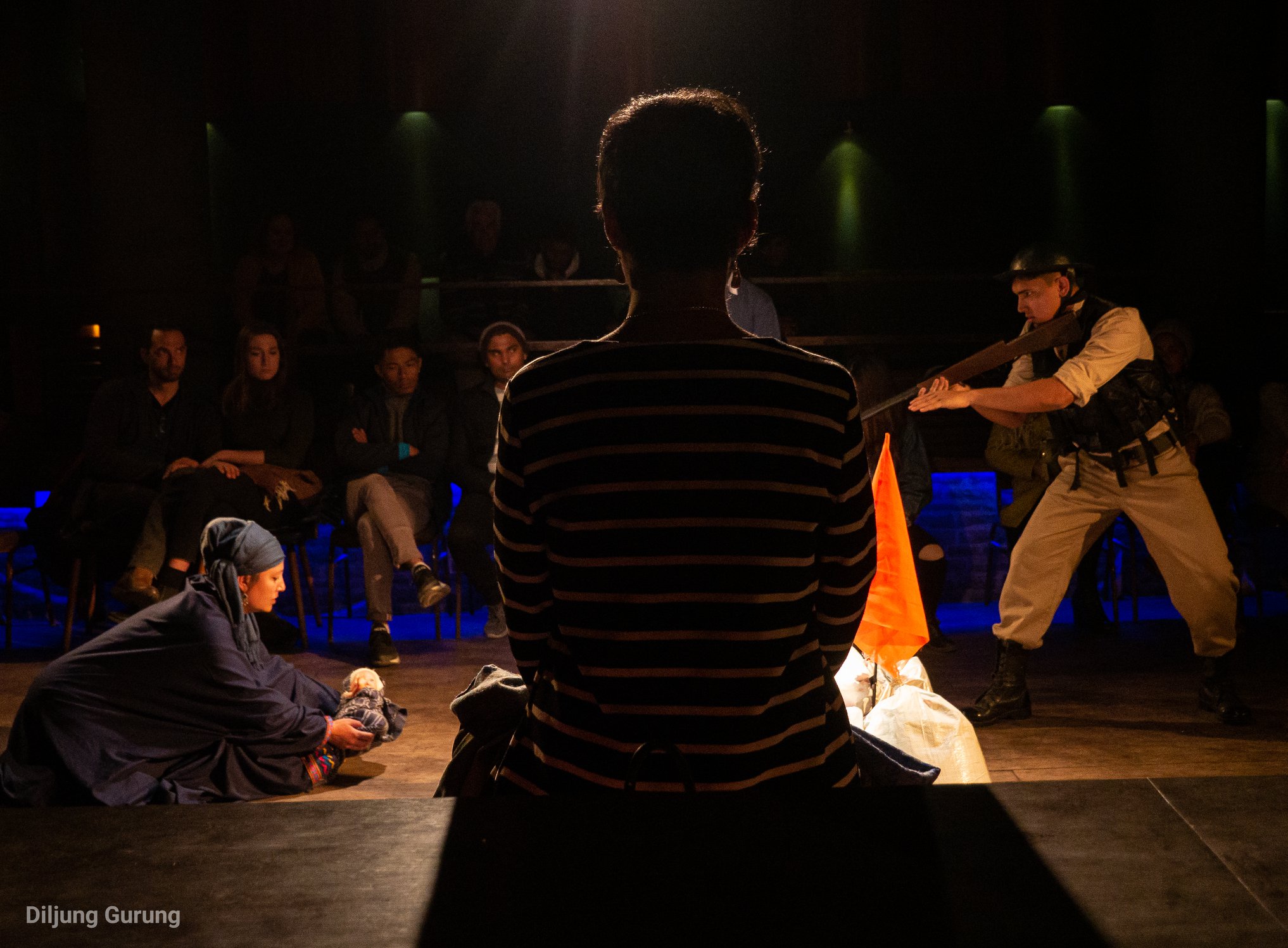 In the Sand and the Snow came to me as a kind of moral imperative, after reading Adam Rapp’s haunting parable in a special edition of the New York Times, “Imagining America in 2024” (29/4/2019). I imagined it as the kind of underground production that happens under repressive regimes in university basements or deserted nightclubs; our play, too, is rogue, outside of our planned theatre season, with a budget to be raised. The OWT artists, seasoned and newcomers, readily joined the project, taking small salaries, contributing their time, ideas, and literally the clothes off their backs. They created their characters, both on the stage and in the audience “witnessing each other witnessing the play” with intelligence and integrity.